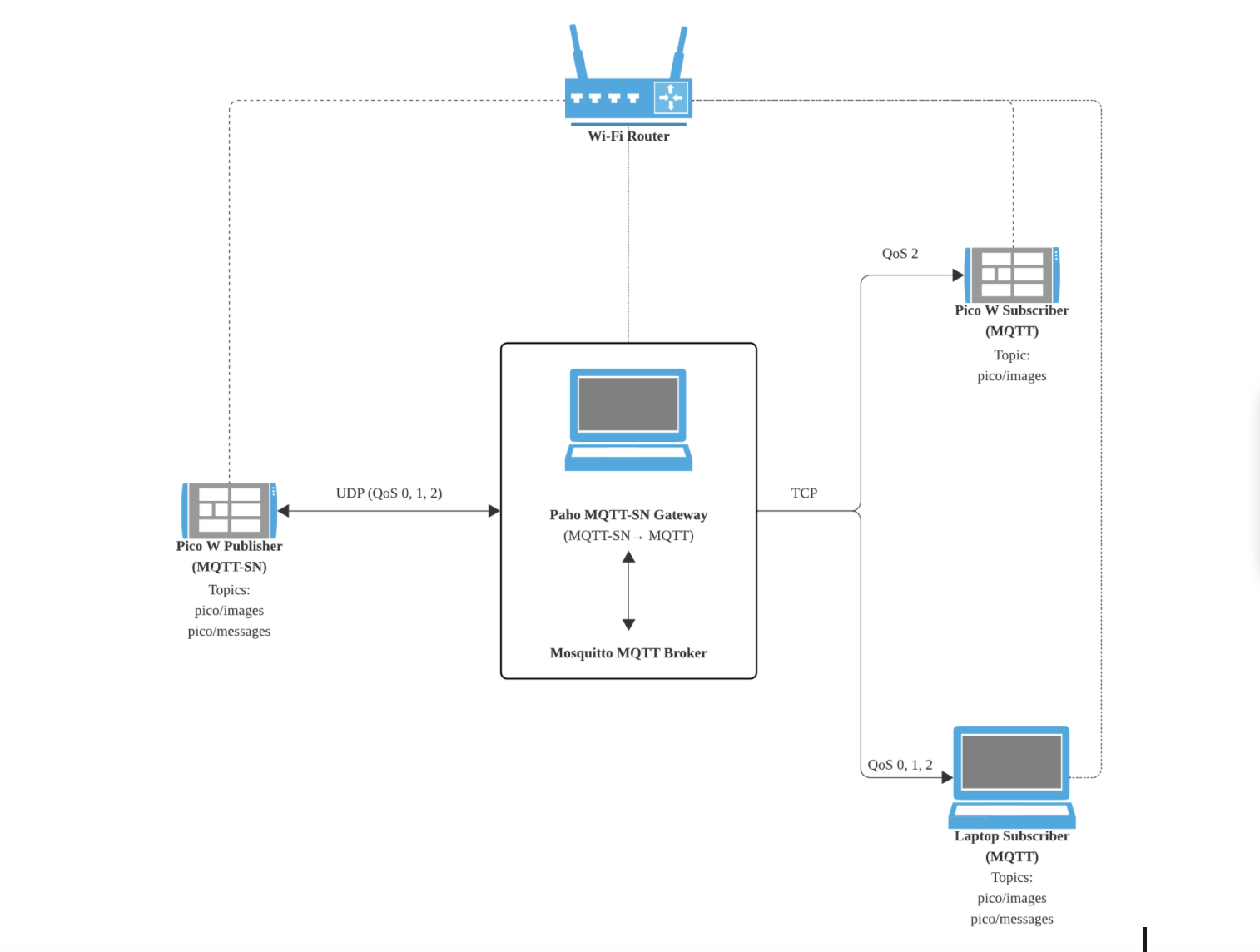 Embedded MQTT-SN communication system on Raspberry Pi Pico W supporting QoS messaging, retransmission logic, and SD-card image transfer.