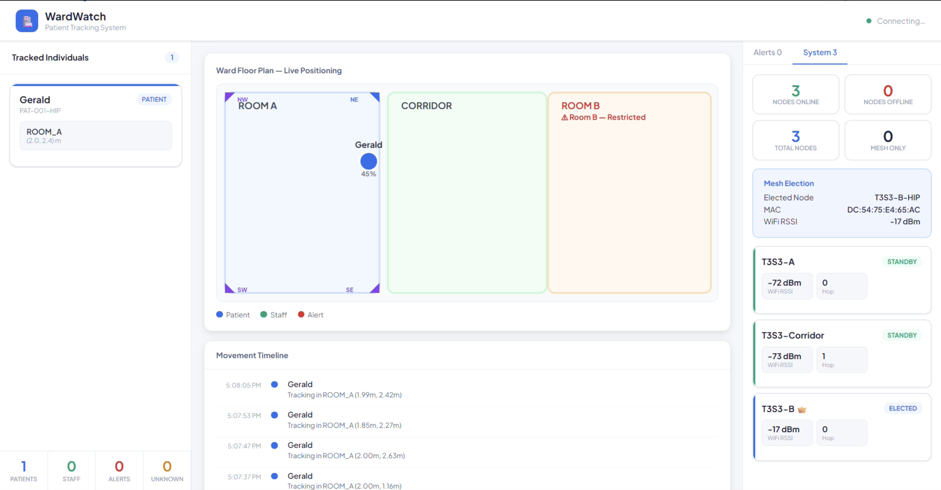 Privacy-preserving BLE indoor patient tracking mesh for hospital environments using localisation, ESP-NOW coordination, and MQTT delivery.